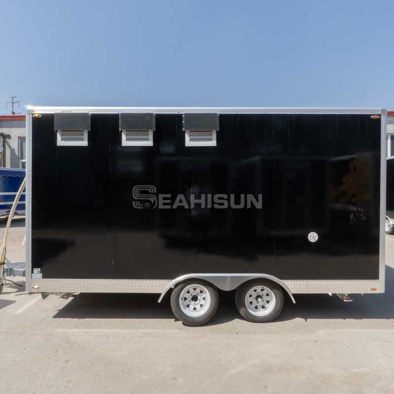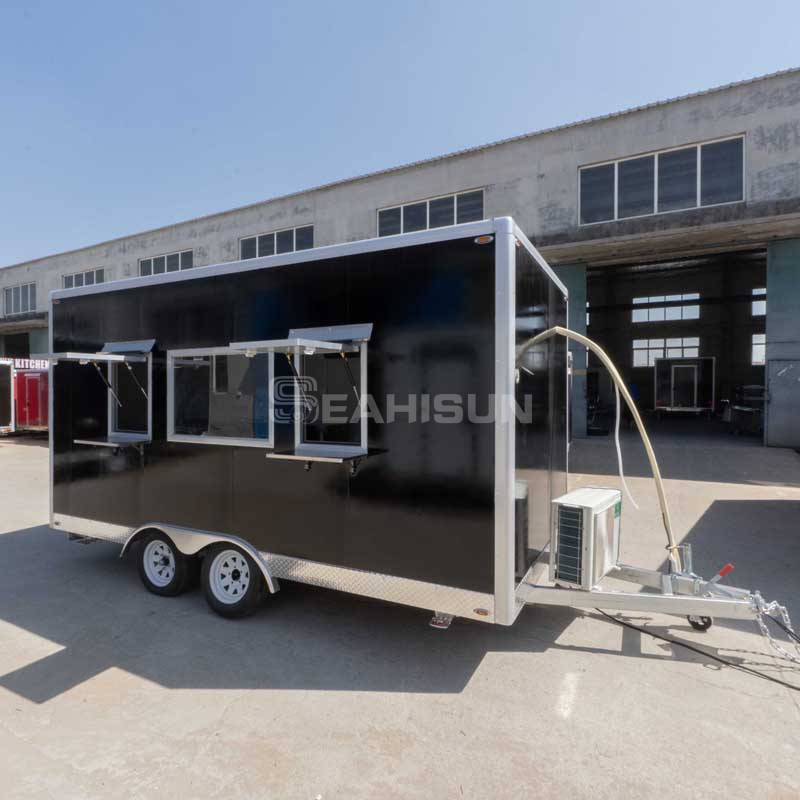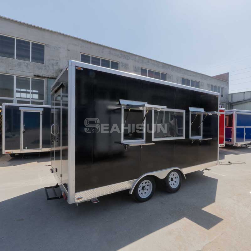 内部布局优先考虑工作流程效率。烹饪台位于后部,煎锅和煎锅放置方便。配有不锈钢台面的专用准备区可用于组装餐食,而双水槽则可确保适当的卫生习惯。台面下方的储物柜和头顶架子可将食材和餐具井井有条。拖车的电气系统支持多种设备,燃气连接经过安全认证。带有可伸缩遮阳篷的大型服务窗增强了客户互动,并在服务期间提供遮阳。