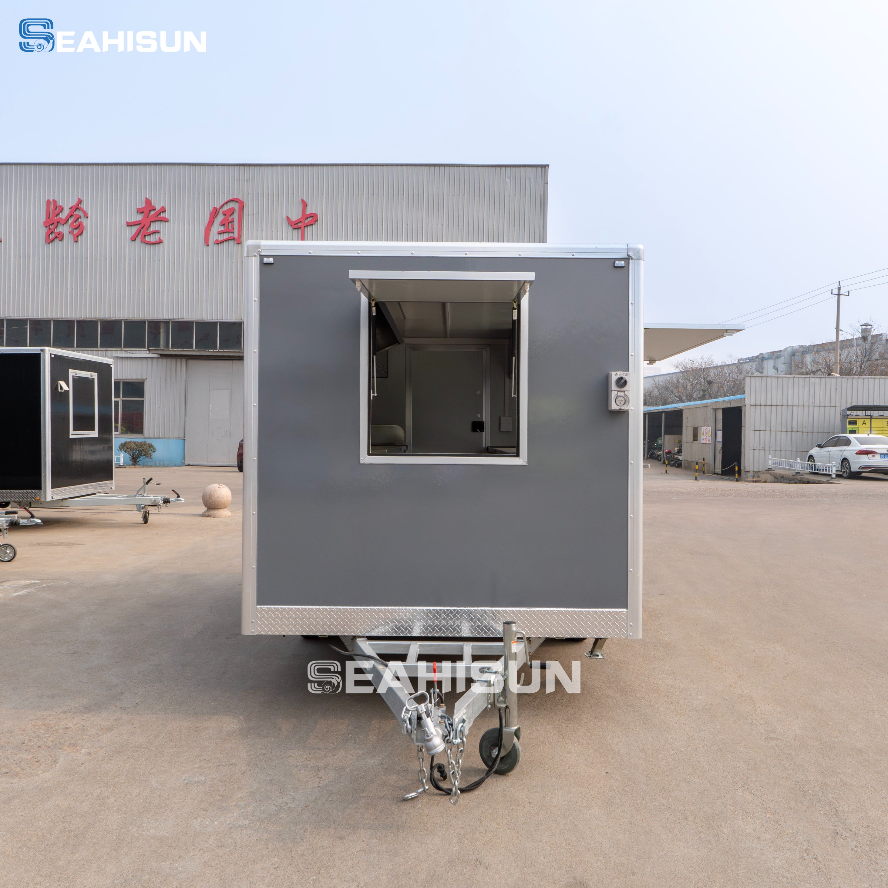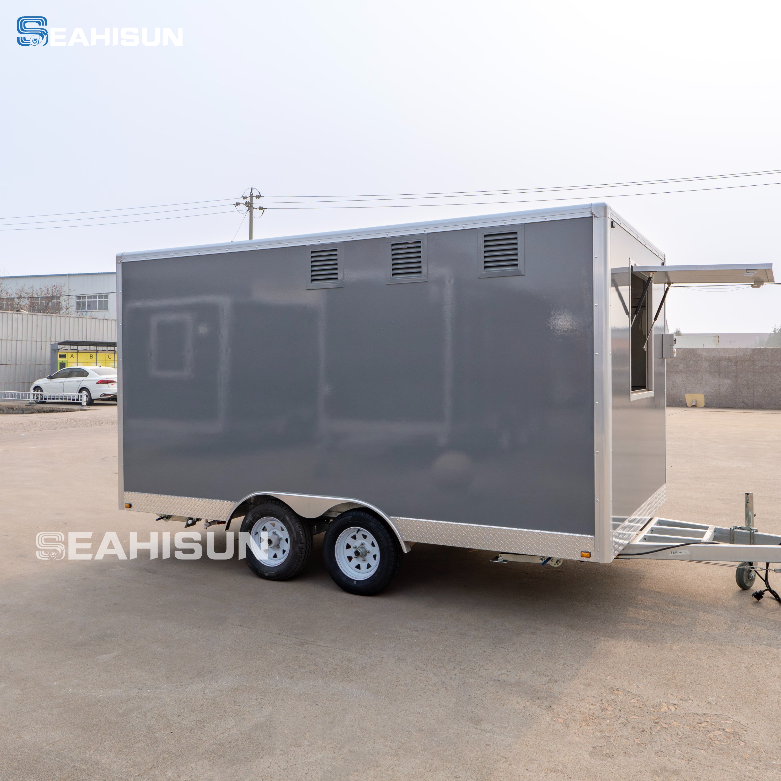 方盒设计:拖车采用整洁的矩形盒结构,线条干净、坚固,具有专业和工业的外观,非常适合移动厨房。