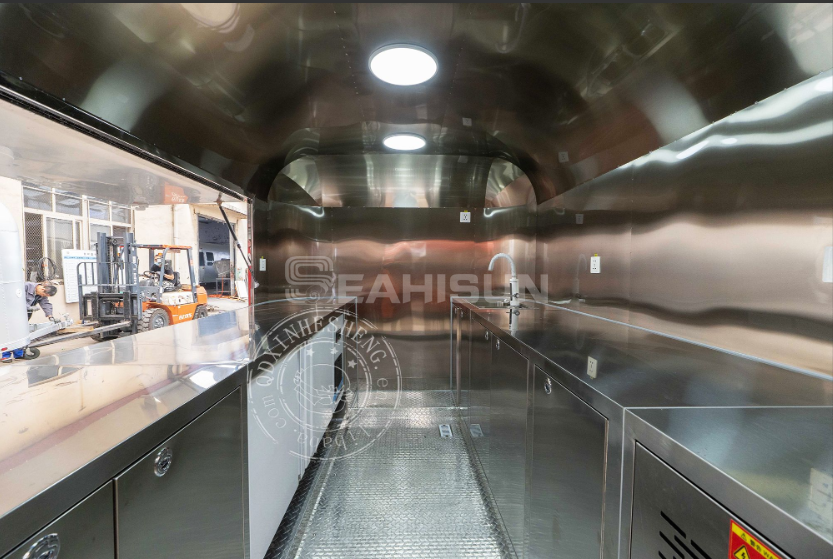 配备不锈钢操作台,易于清洁,水槽区设有符合卫生标准的净水及污水处理系统。尺寸和颜色可以定制,外部也可以选择不锈钢材质。