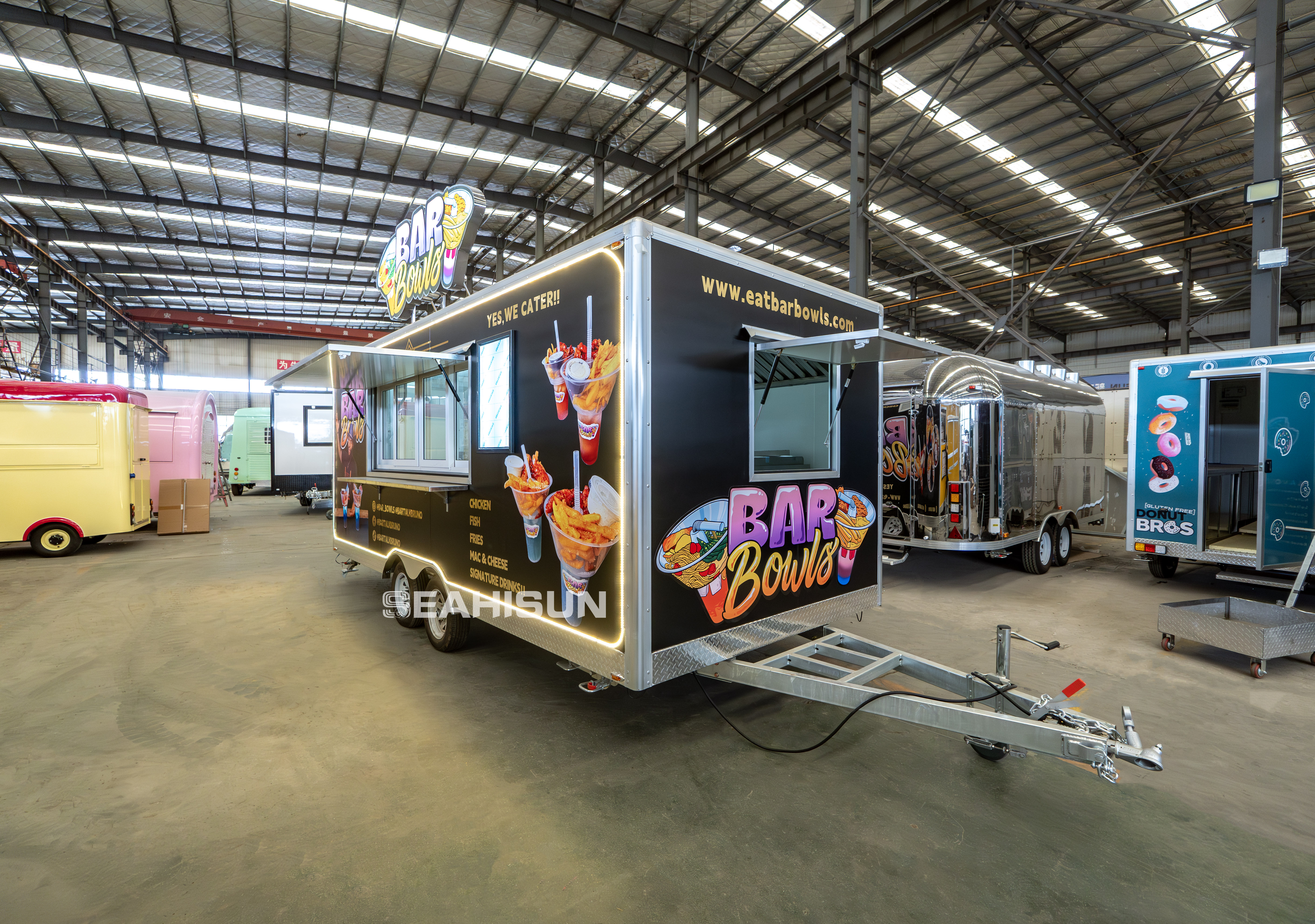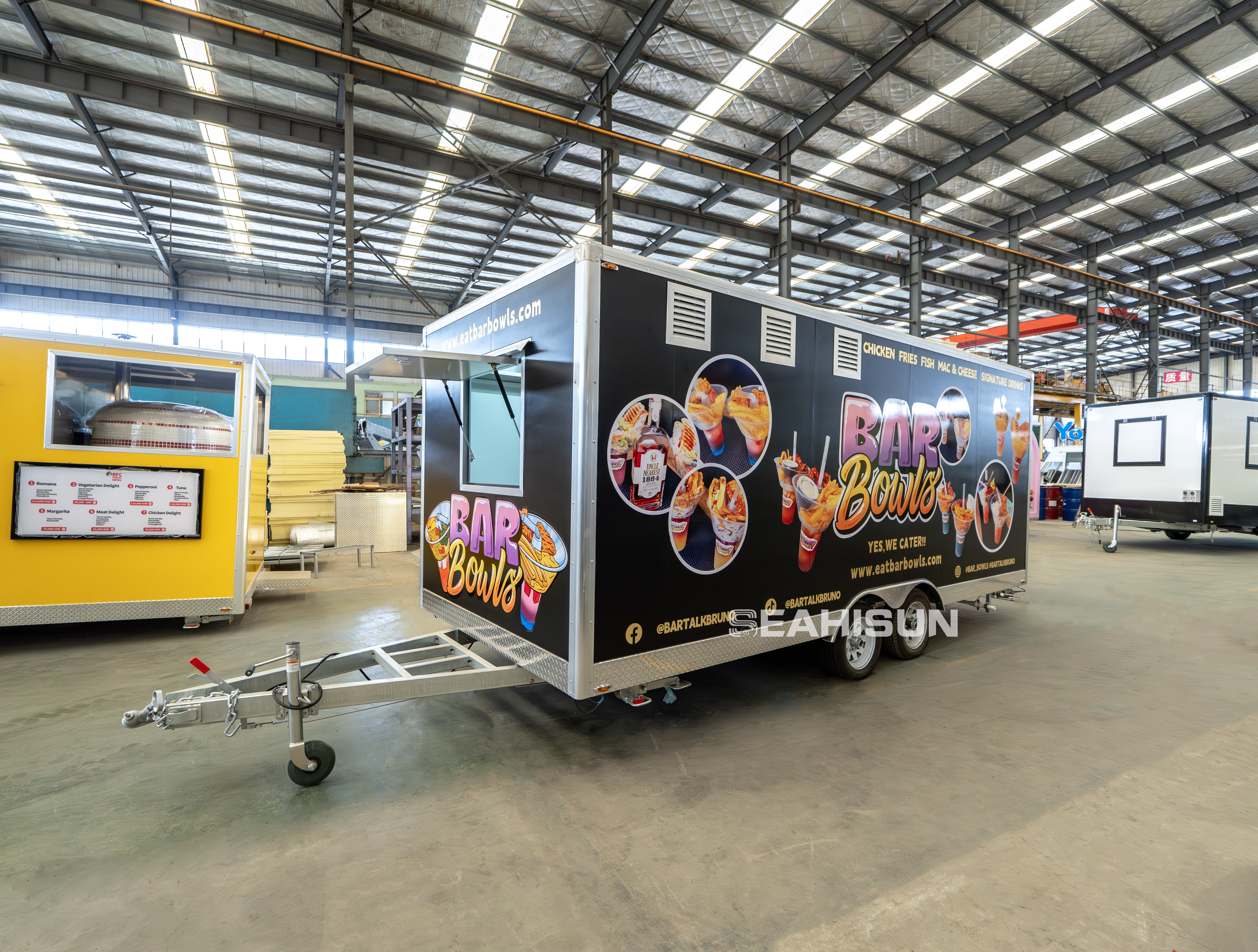 服务窗口: 食品拖车设计有多个服务窗口。主服务面(长边)设有向上开启的大窗户,形成遮阳或防雨的天篷,方便顾客下单和工作人员服务。