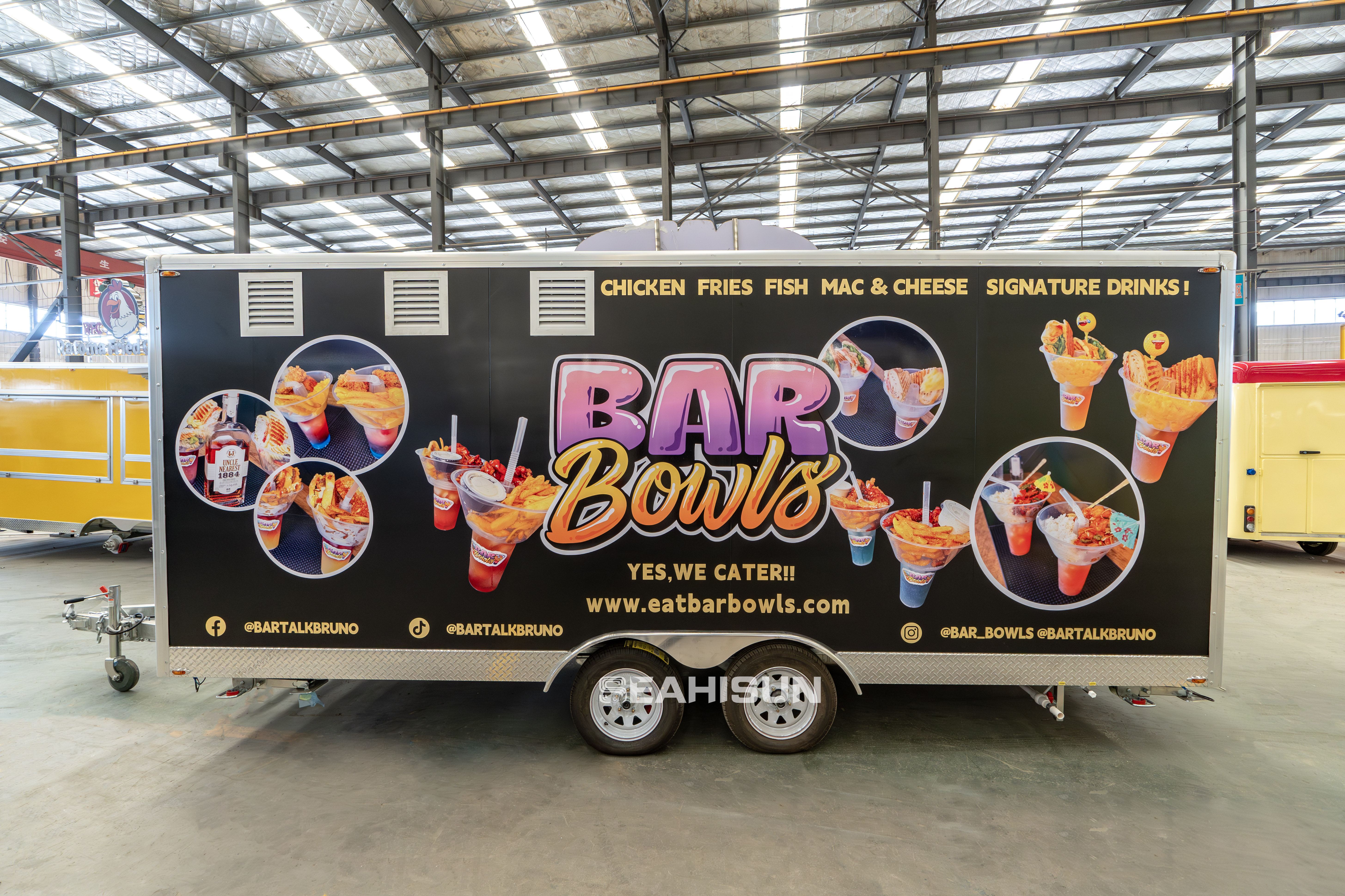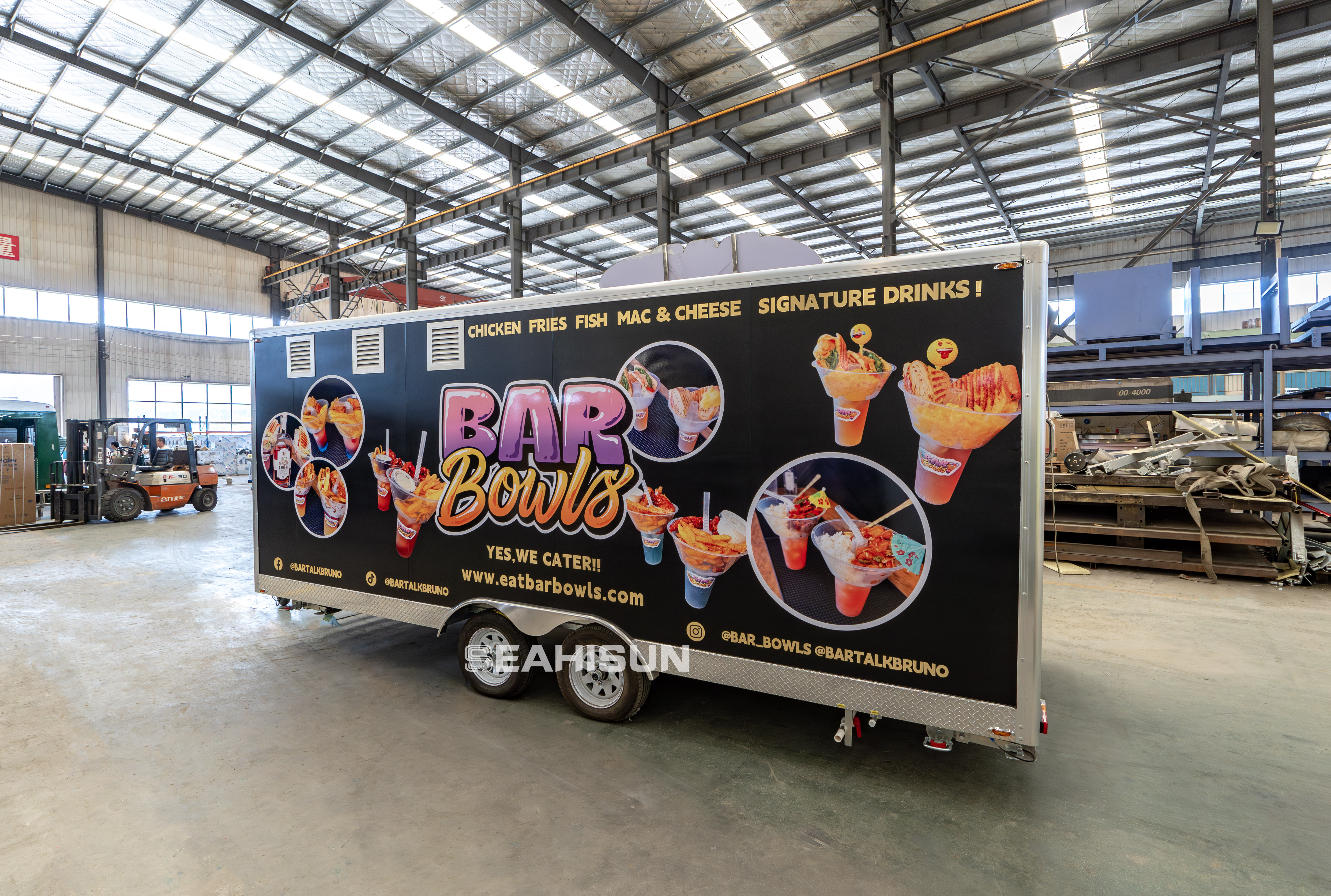 通风系统: 拖车的顶部和侧面都配备了明显的通风口和排气系统,这对于移动厨房至关重要,可以有效排出烹饪油烟和热量。