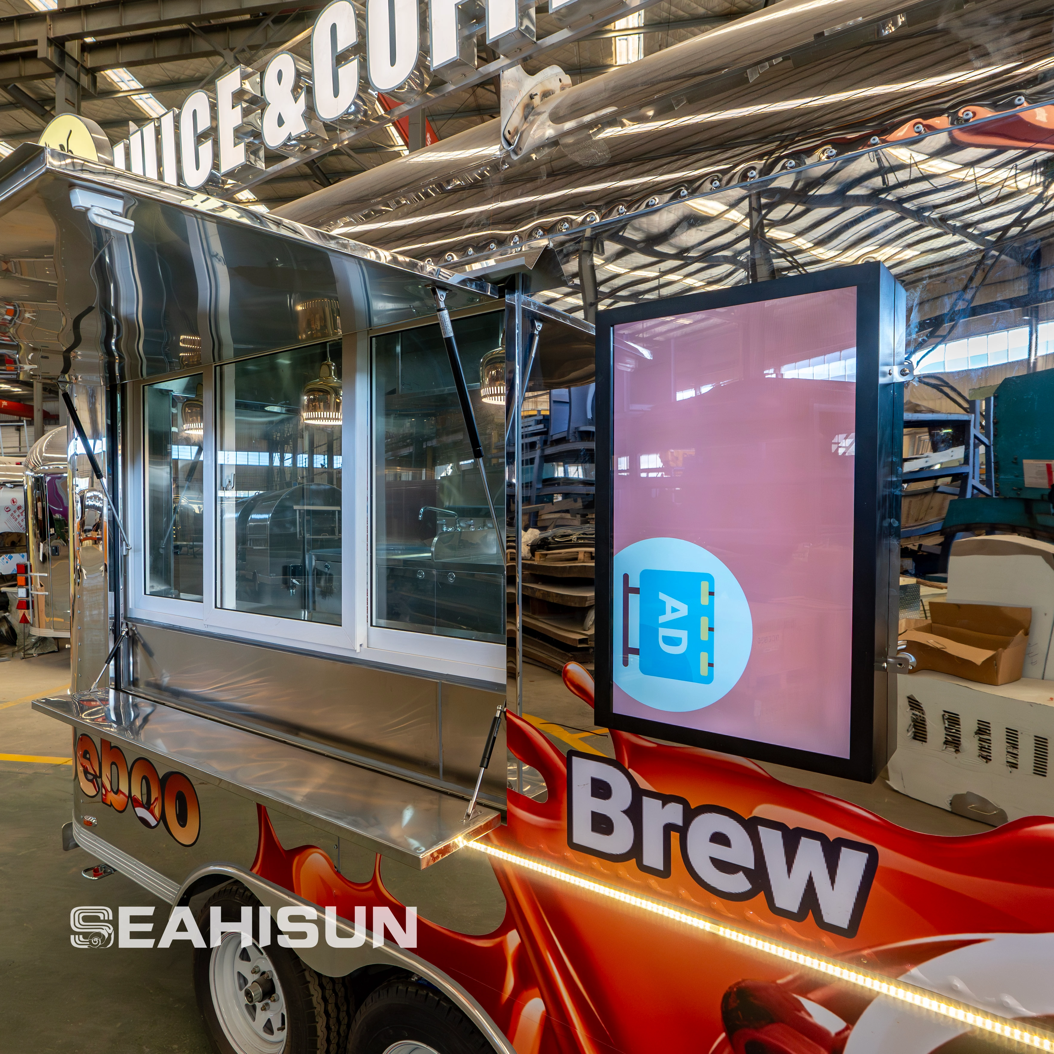 拖车的内部完全由食品级不锈钢制成,确保卫生标准和耐用性,满足商业餐饮的严格要求。
