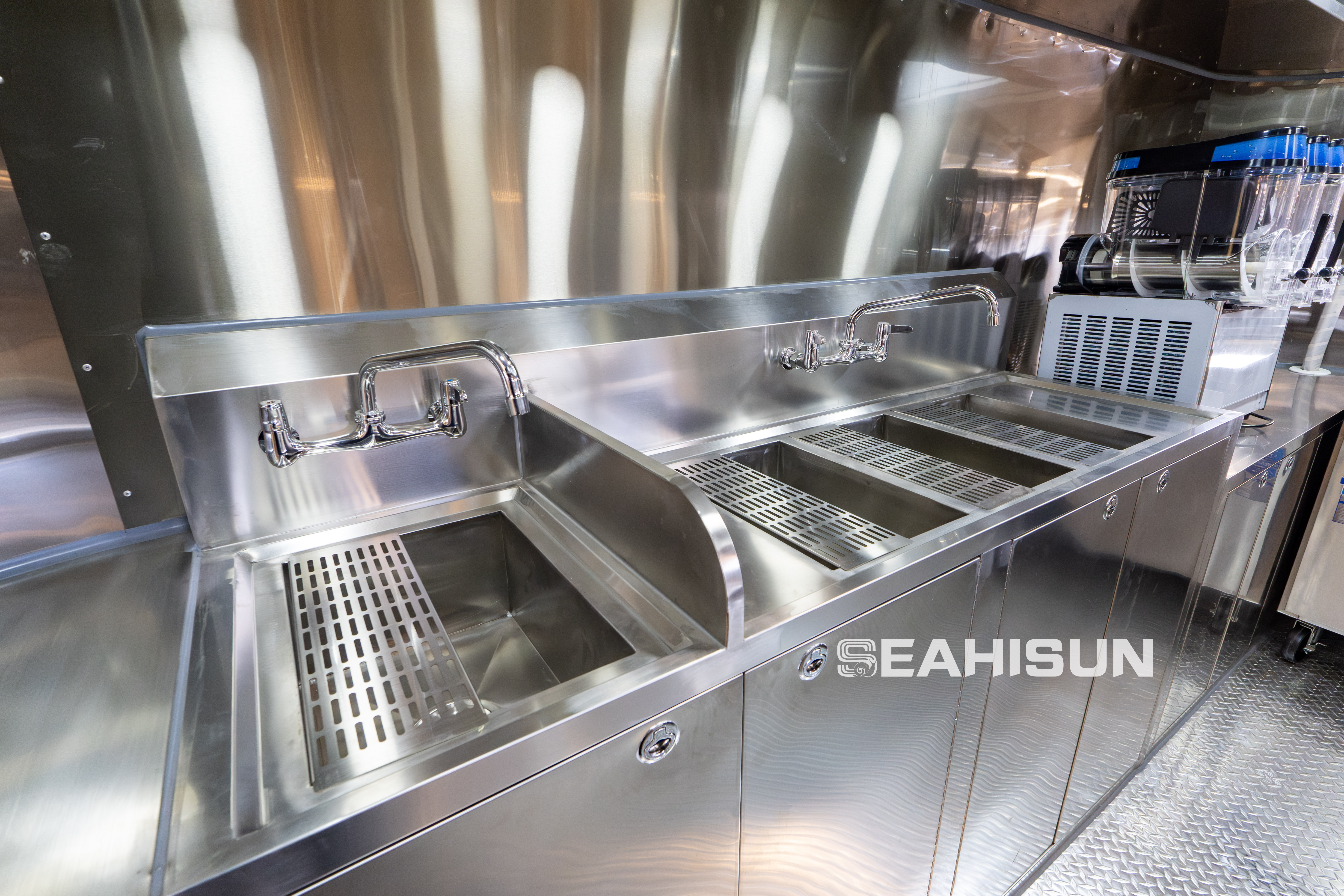 2.专业水系统:符合卫生规范,内部配备多隔间不锈钢水槽系统(一般包括清洗水槽、漂洗水槽、消毒水槽),配有商用高层水龙头,满足日常清洁需求。