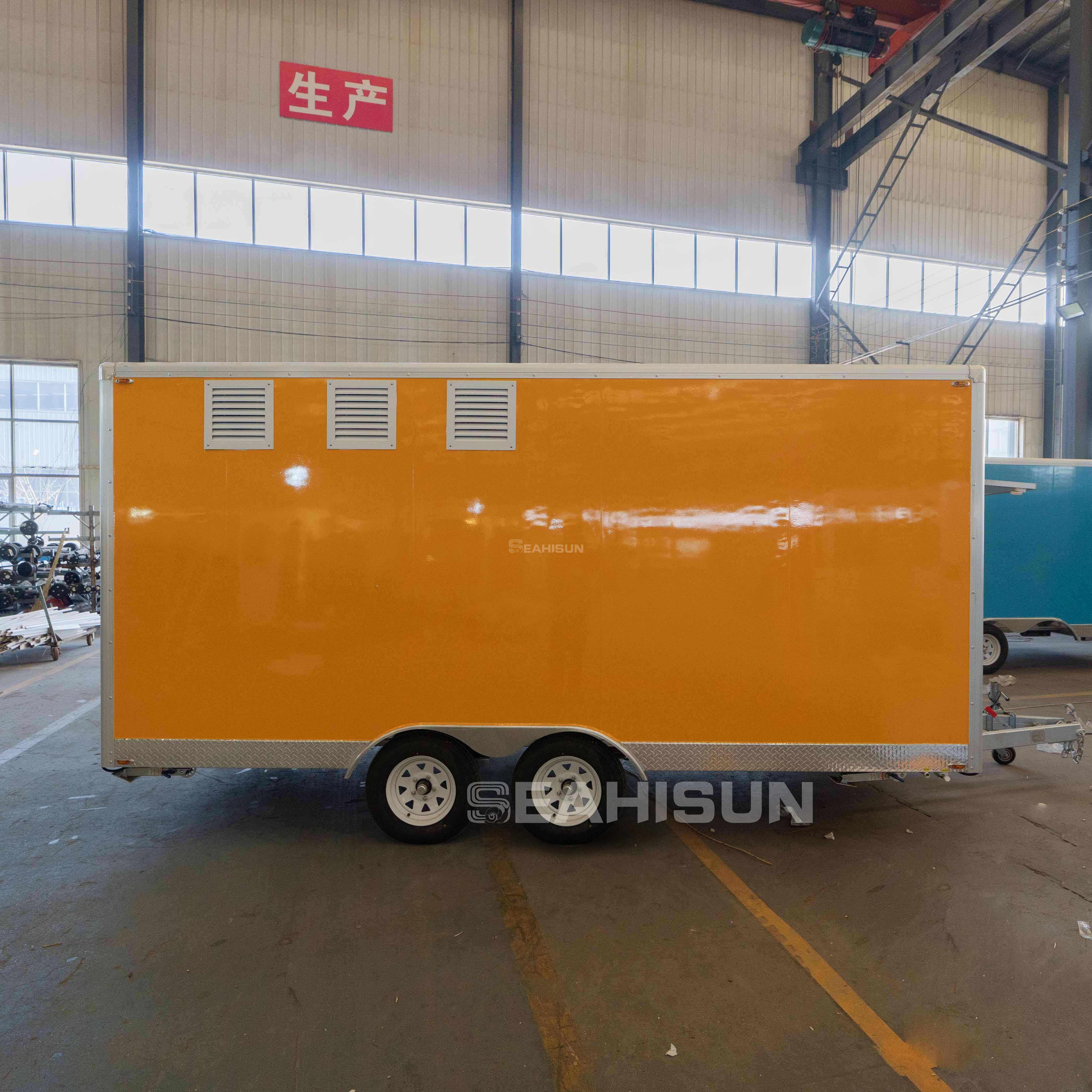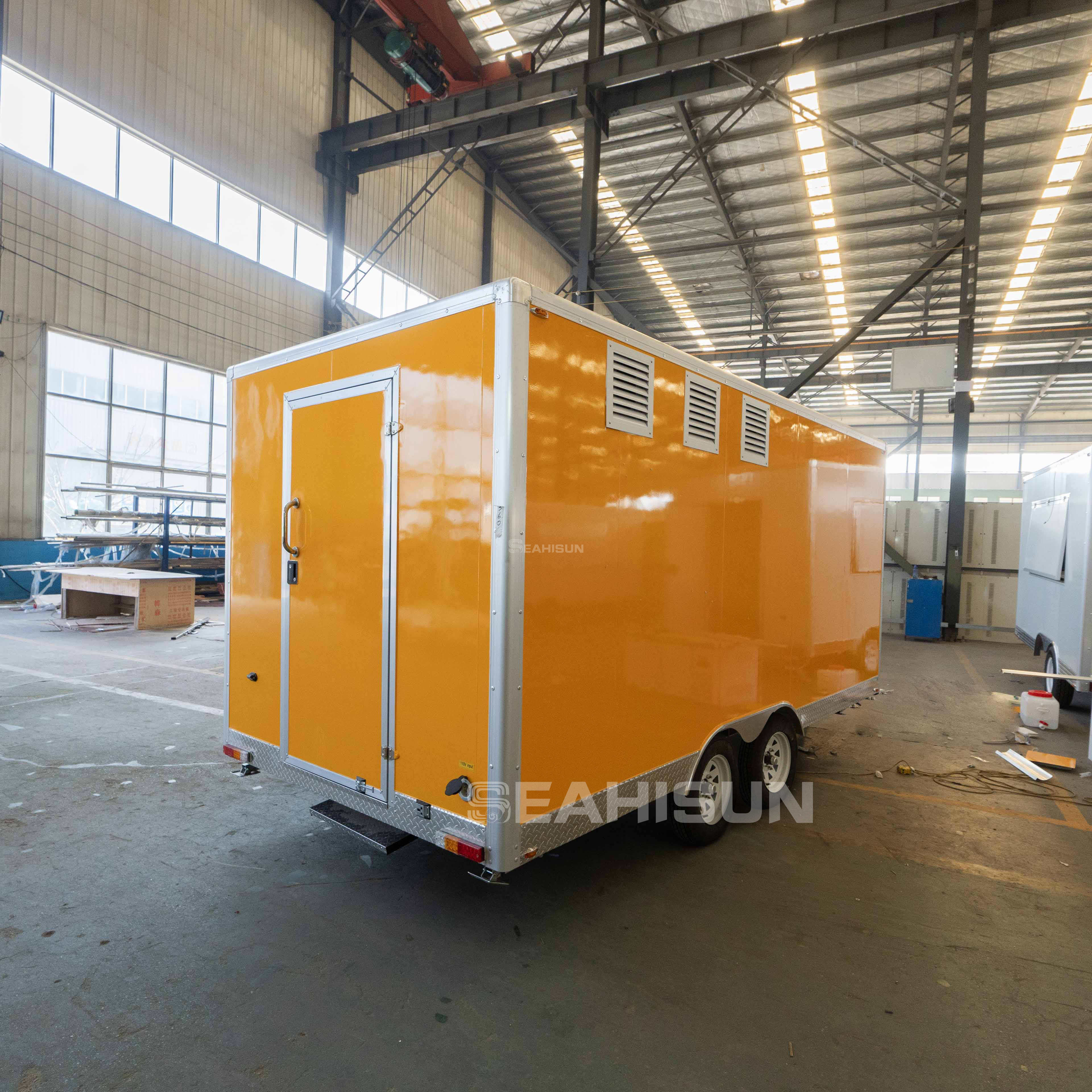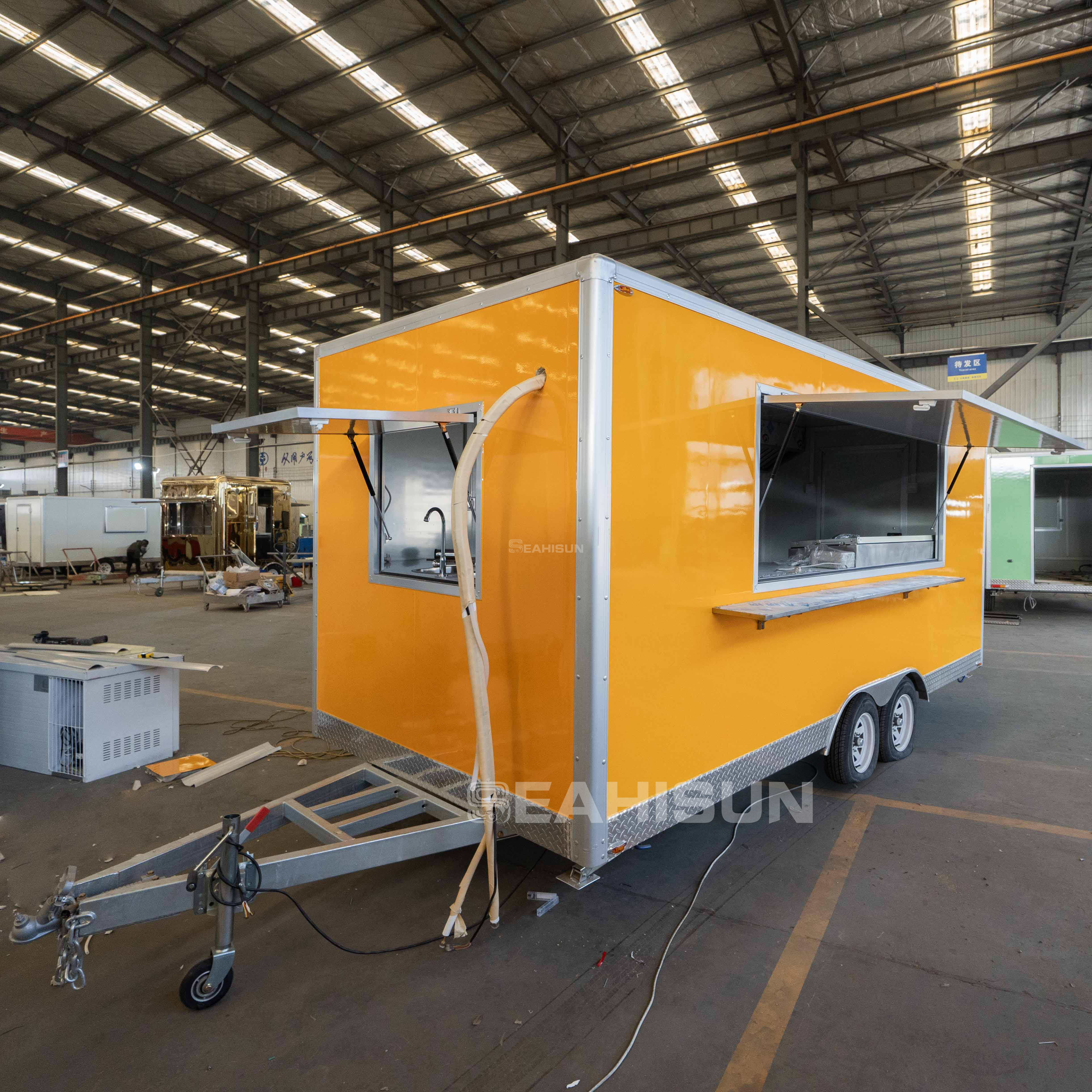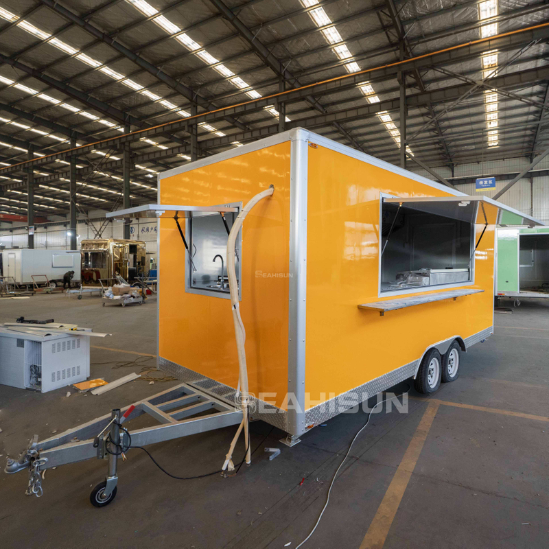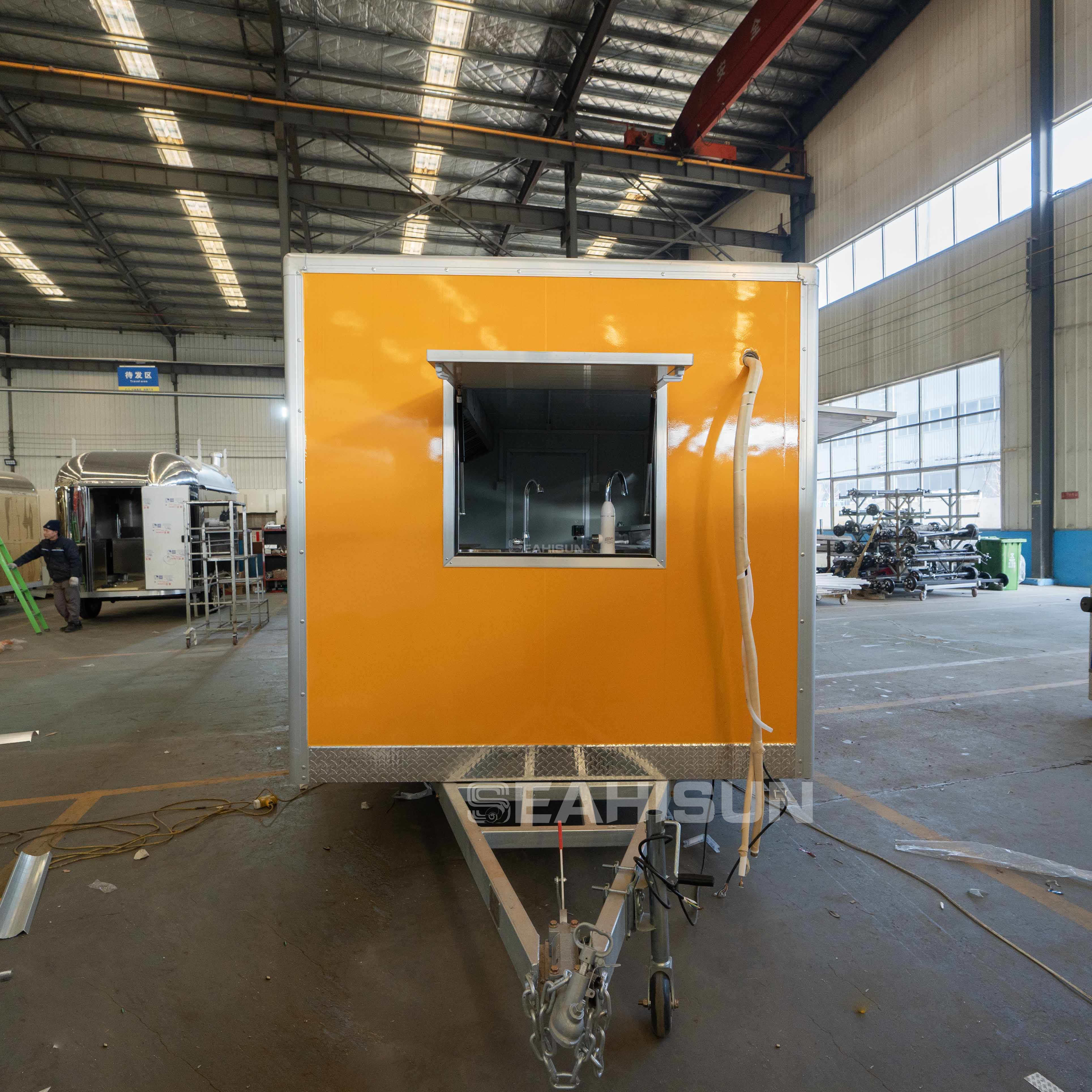 食品拖车内的地漏位于水槽附近,以方便排水。