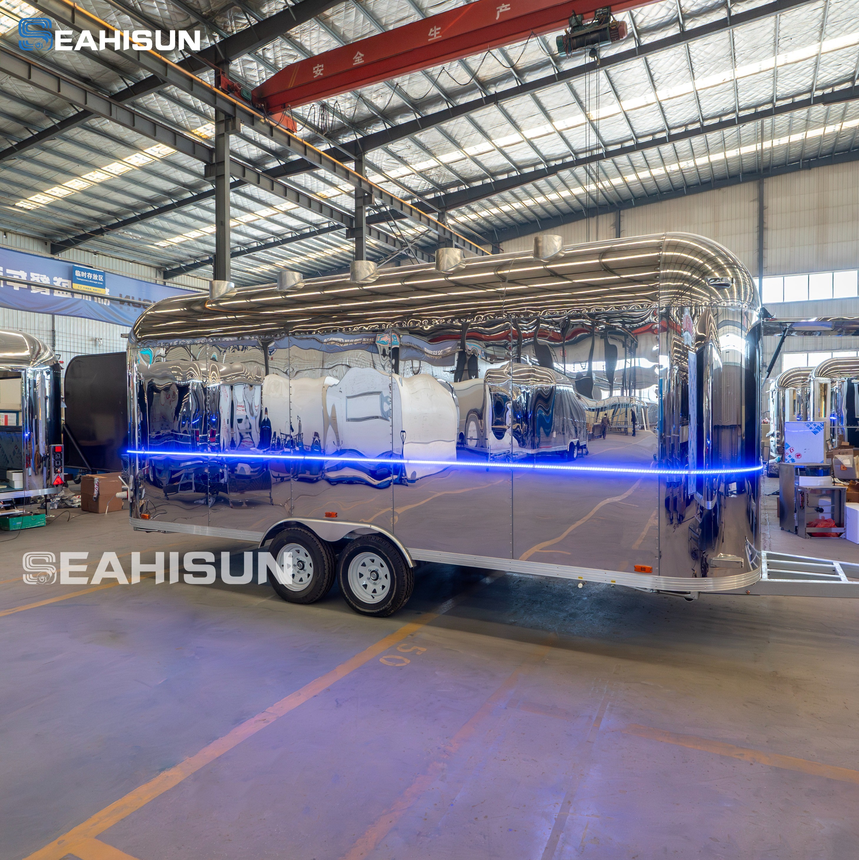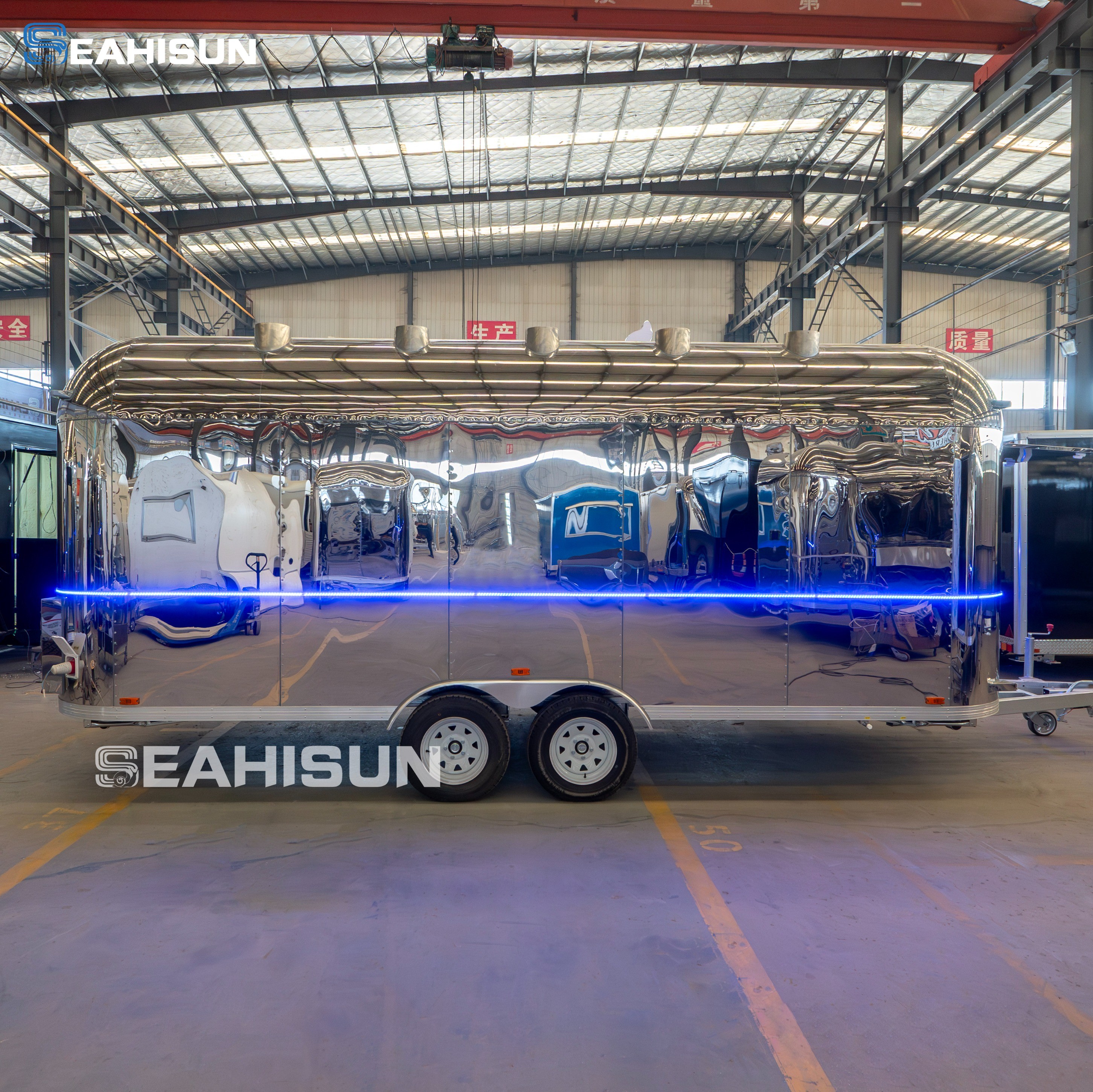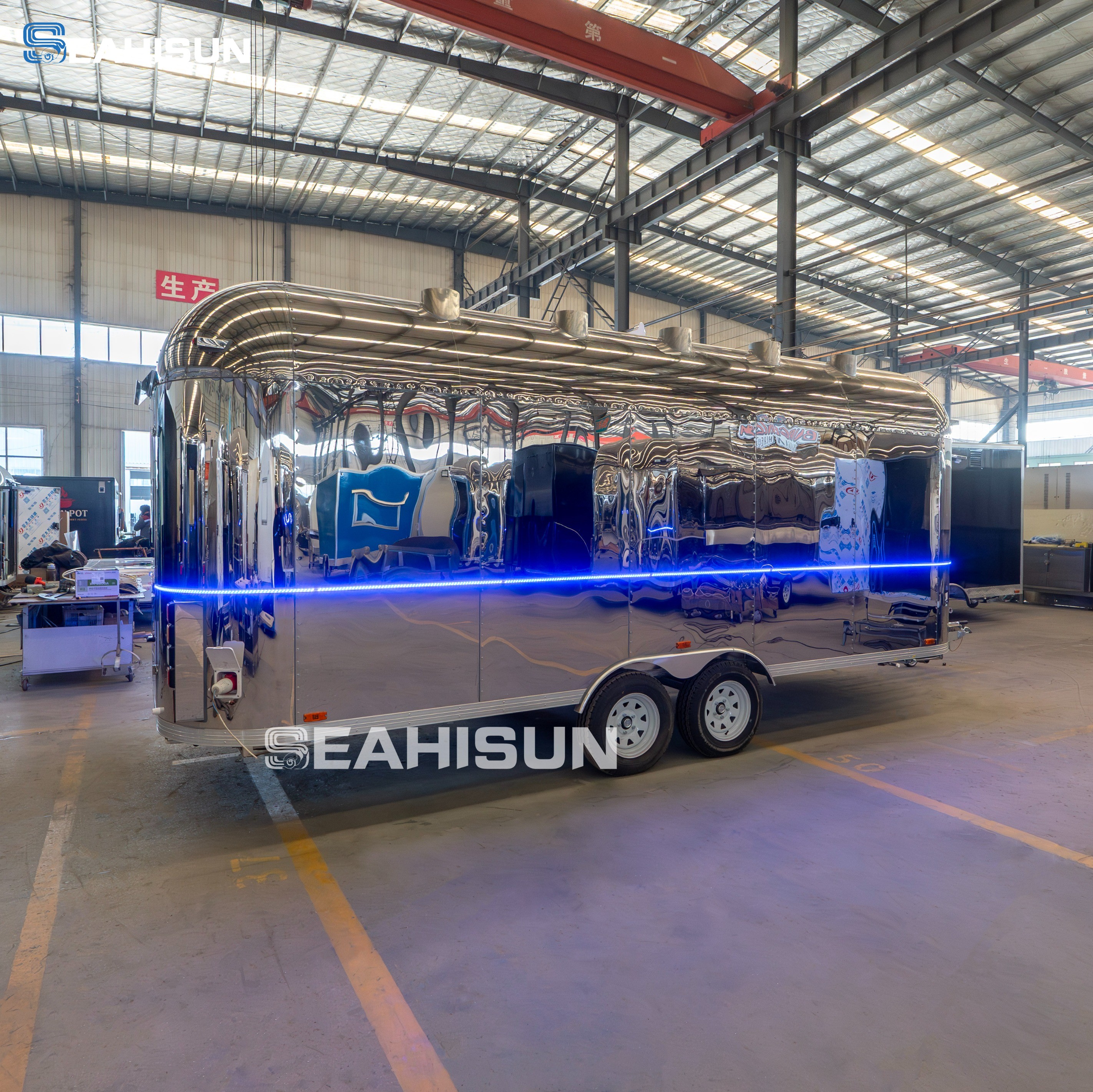 蓝色氛围灯带(机身底部) :柔和的蓝色氛围灯安装在机身底部,可以在夜间或光线昏暗的场景(如夜市、音乐节)点亮。它不仅增强了餐车的档次感和时尚感,而且还起到了辅助照明的作用,让餐车在黑暗中更加醒目。