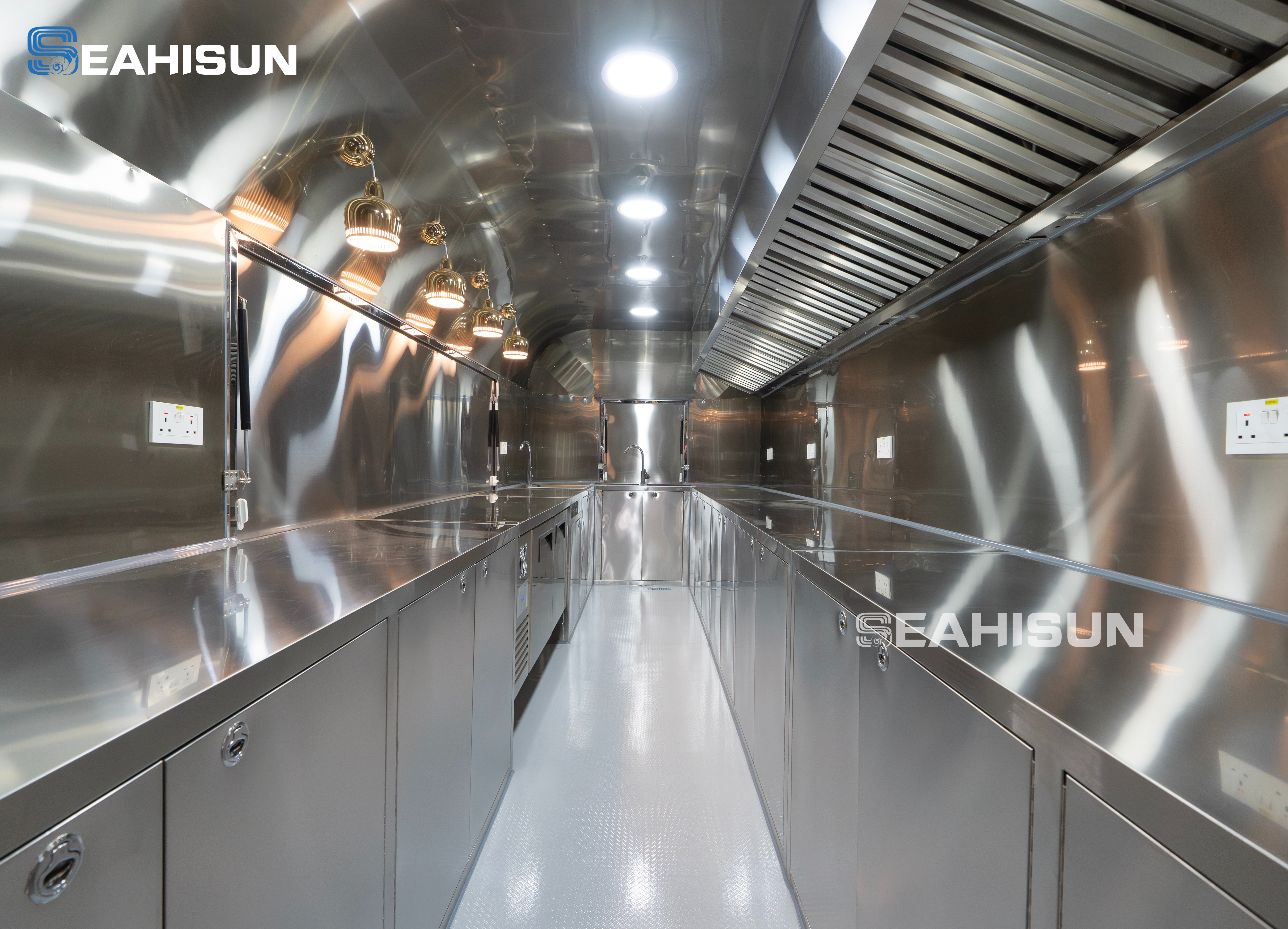 专业通风排烟系统:内置大功率通风排烟设备,可将烹饪(如煎、炒)时产生的油烟和异味快速排出车外,保持餐车内部空气流通,避免工作人员在恶劣的油烟环境下工作,也防止油烟凝结在内部设备上影响使用寿命。