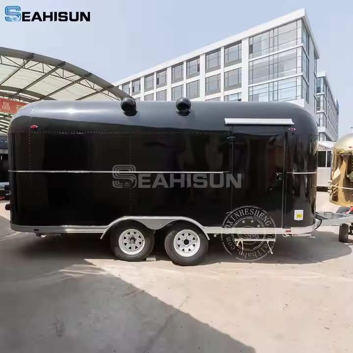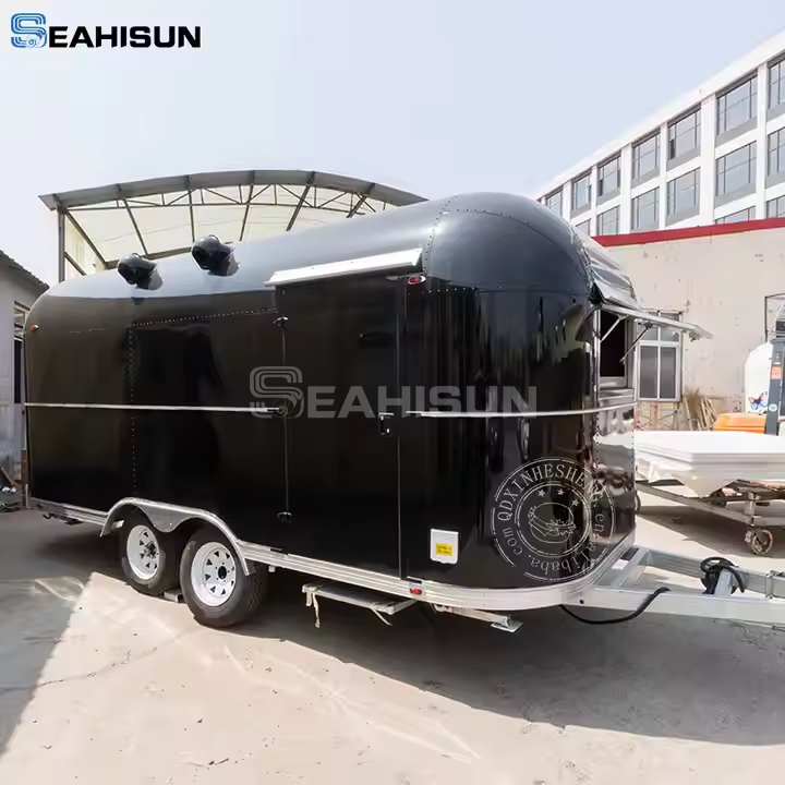这款小型 Airstream 食品拖车的主要特点之一是其广泛的定制功能。企业可以选择不同的尺寸和款式来满足其特定要求。预告片还可以定制各种颜色选项和徽标位置,使企业能够突出展示其品牌形象。内部采用双面不锈钢柜,双门和底部密封板,提供充足的存储空间,同时保持食品安全标准。无论您是经营咖啡店、快餐店还是老式 Airstream 食品拖车,这些定制选项都能确保拖车满足您的特定需求。